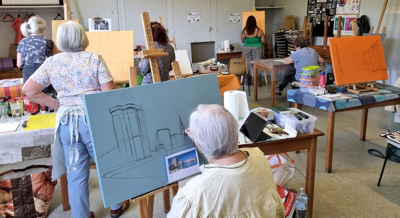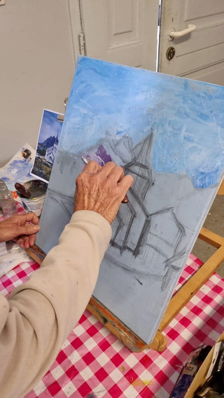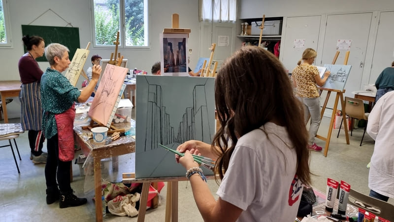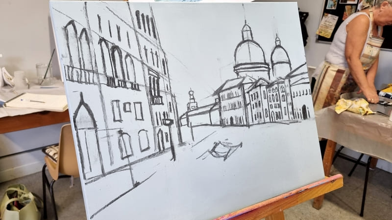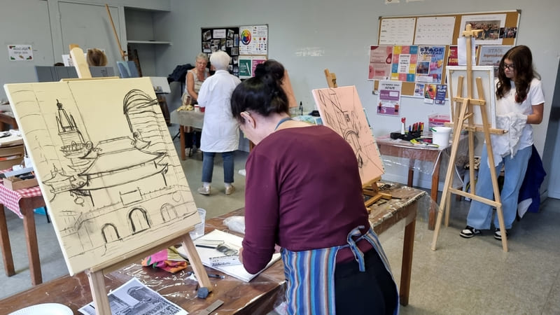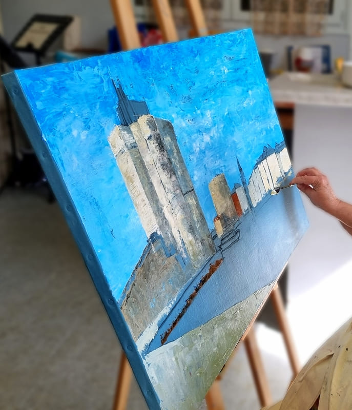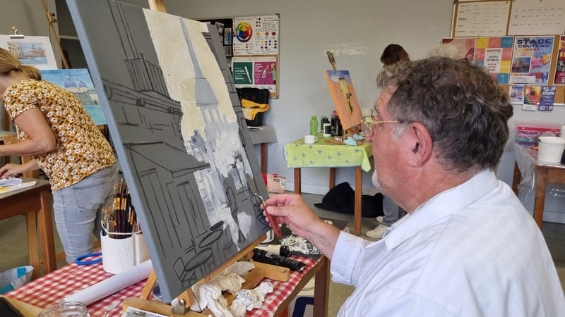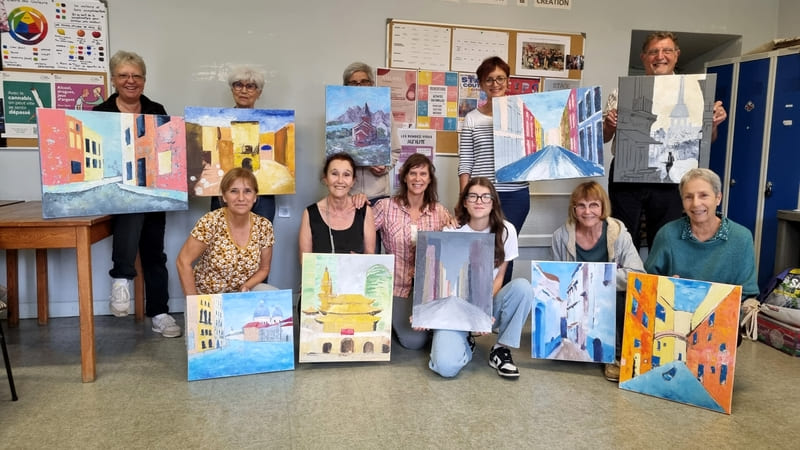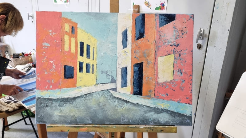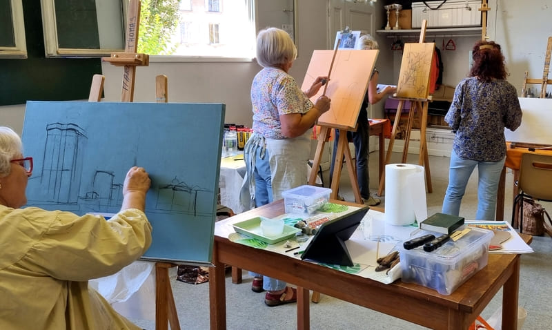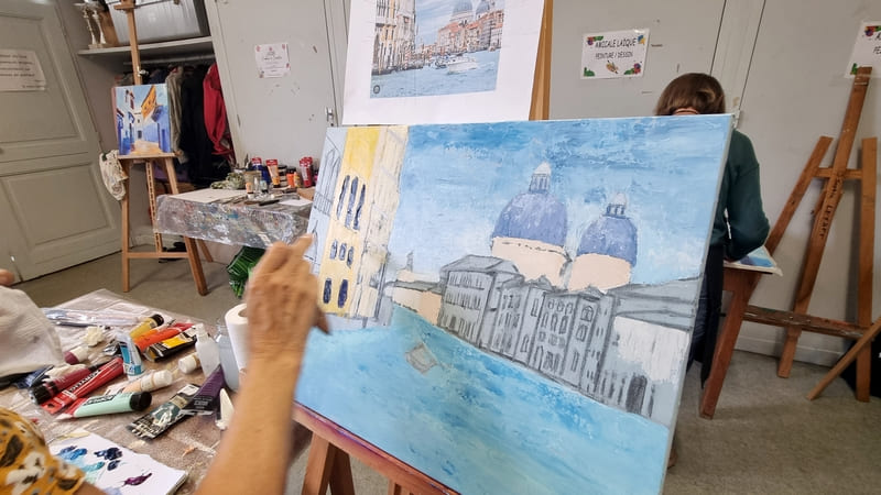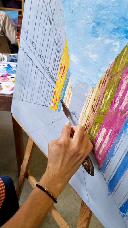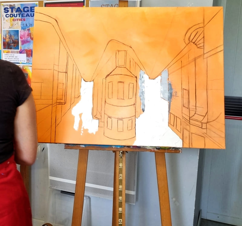 Elle représente aussi un casse-tête récurrent pour nombre d’artistes, même confirmés, et ce, depuis six siècles. Alors, pour l’ouverture de la saison 2025-2026, nous voici lancés dans l’exploration de cette dimension moins picturale (quoique… il fallait quand même peindre au couteau !) et plus technique de la peinture. Avec des choix de sujets surprenants, incluant un, deux ou trois points de fuite… pourquoi faire simple ? Je vous emmène à la découverte du travail de mes stagiaires, non pas sur une, mais sur deux dates, car comme il n’y avait pas assez de place pour tous sur ce stage, j’en ai rajouté une.